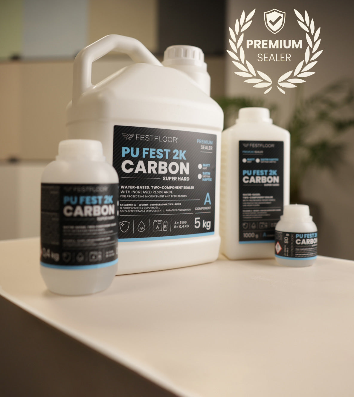 The world of microcement has just gained a new leader in surface protection – PU FEST 2K CARBON sealer. This premium, water-based, two-component varnish has been created for the most demanding users. Thanks to its polycarbonate formula, it sets a new standard in durability and resistance.