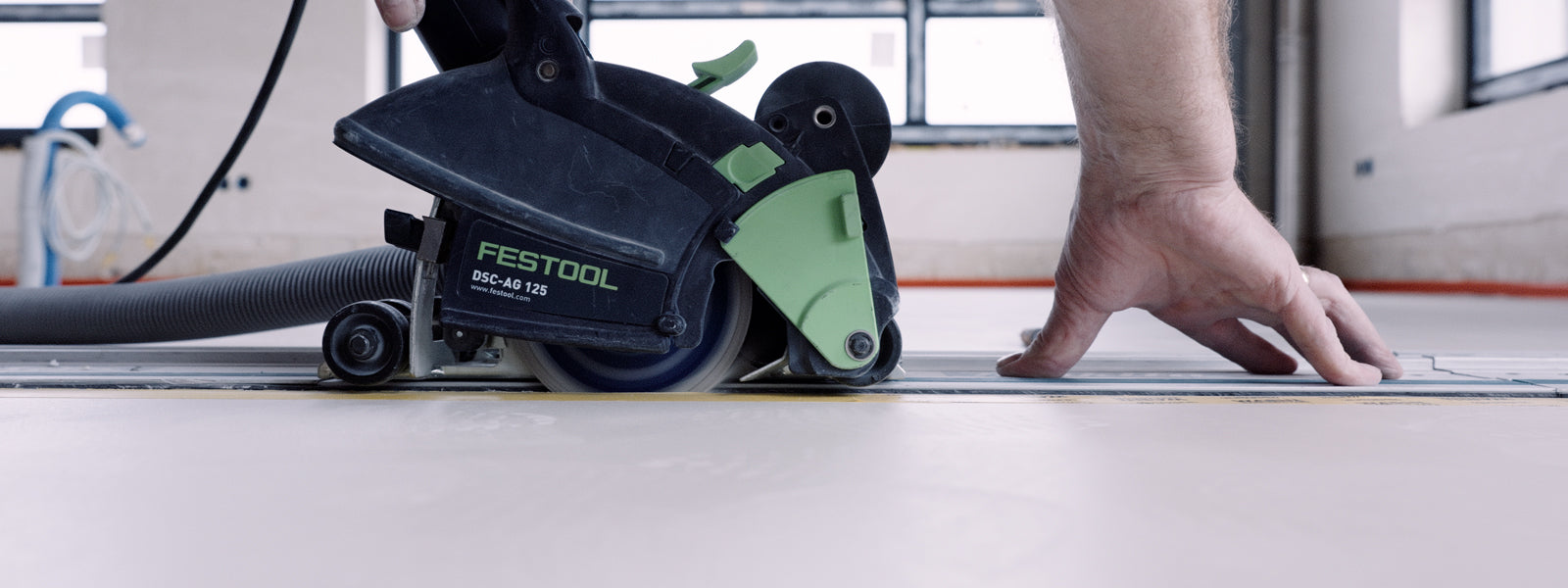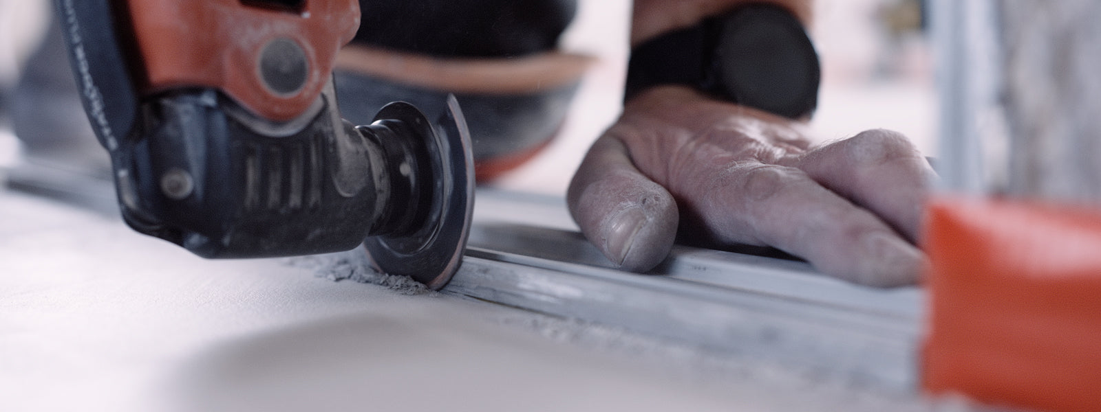 Once the microcement has dried, we cut the expansion joint in the same location as in the screed. This task requires precision and high-quality equipment. There is no room for even the smallest mistake, as any imperfection will be highly visible. The best tools for this job are a laser, guide rail, concrete saw, and multitool. Finally, the joint is filled with expansion joint compound.