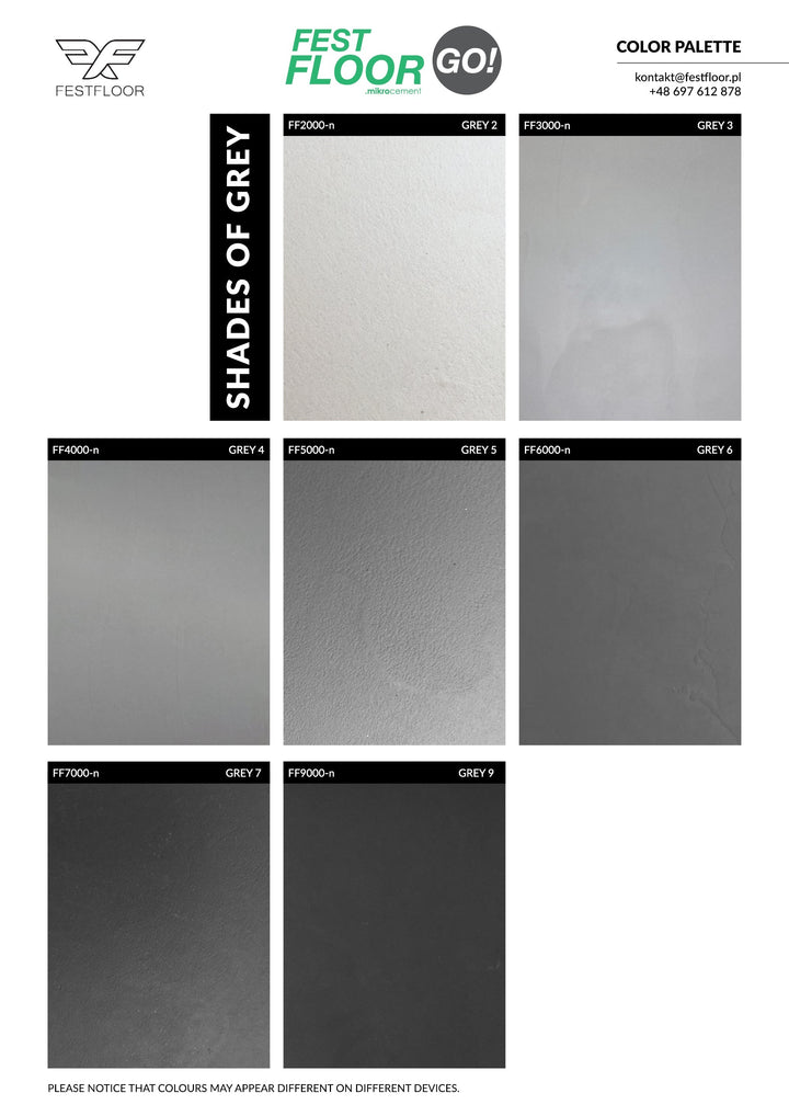 Festfloor GO! betonová stěrka je k dispozici ve standardní paletě 22 barev. Na požádání můžeme také připravit betonovou stěrku v barvách z palety RAL nebo NCS.